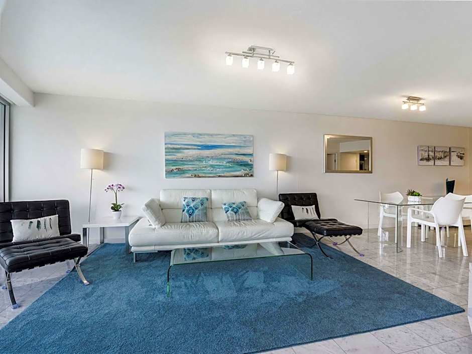 This modern air-conditioned open-plan apartment features a balcony with ocean views and a separate living area with cable TV. Two bathrooms, a fully equipped kitchen and laundry facilities are included.